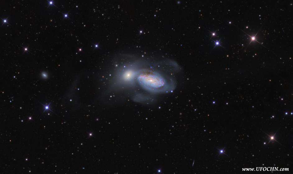 这幅望远镜影像,记录了大螺旋星系NGC 3227和较小的椭圆星系NGC 3226动荡生涯之瞬间。除了捕捉到它们正在进行重力拥舞之外,高灵敏相机的影像也呈现它们历次近距接近时,被星系抛甩出去的黯淡潮汐恒星流束。位在狮子座方向、距离超过5千万光年远的这对星系,因其奇异的外观,而被经典的奇特星系目录登录,成为编号Arp 94的天体。不过,像这样的星系碰撞和合并,现在认为是星系演化的常态,我们的银河系自不例外。跨幅约9万光年的NGC 3227,大小和银河系相当,被归类为西佛型活跃星系,其核心藏着一颗超大质量黑洞。