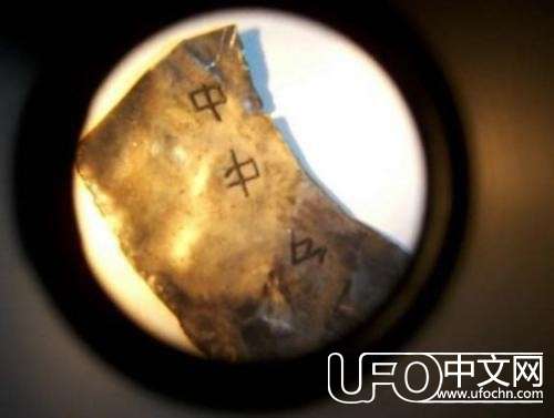 1985年在新墨西哥州的近郊外,被一名不明人士所检到的奇怪金属片,己经送交给UFO研究单位去研究,其中解读文字就只有汉字的;中;可以解读,其金属结构体也调查过,是不属於地球之类的金属, 无法解释出是那一种金属。 UFO学者认为这块金属片可能跟新墨西哥州,发生在1972年UFO坠落事件有关系,其中原因这个金属片太小了可能是政府官方人员没有完全回收。 正面跟反面图片看起来金属大小约一个1块钱左右怎麽小,需要用放大镜放大才能看的到文字。