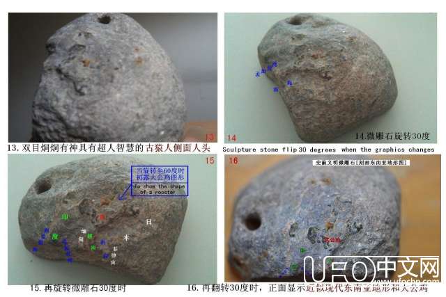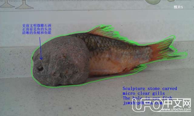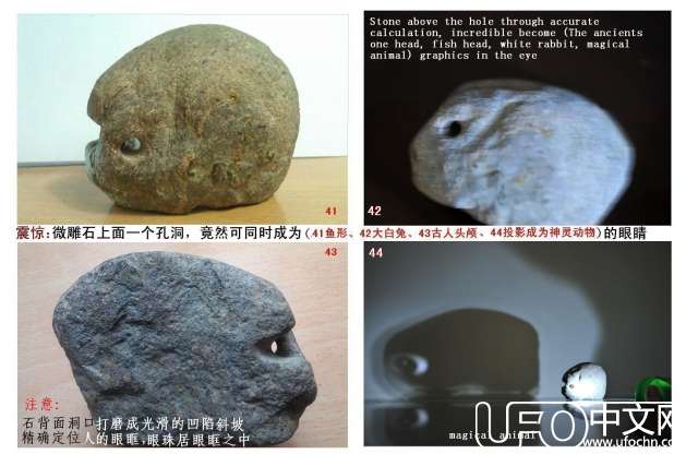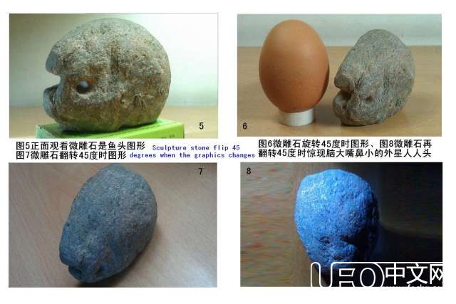令人费解的是、石头从不同角度竟然可以看出近百个逼真的图形,如:正面观看石头好像是“鱼头形状”,竖看石头像是威风凛凛的“古猿人头像”;倒看石头酷似脑大嘴鼻小的“外星人人头”(据目击外星人描述的形象),斜看石头是逼真的“大白兔”图形;石头背型被敲打成轮廓完整的“古人头颅”形状。