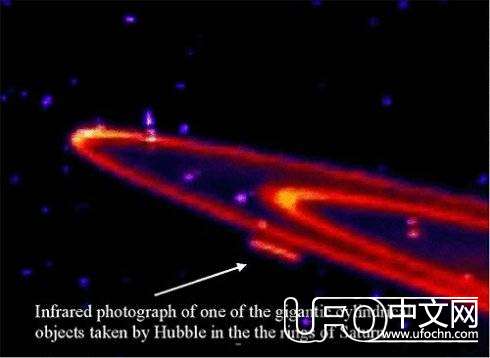 上面的图是探测器在土星发现有大型的雪茄型物体停在土星外环上!!