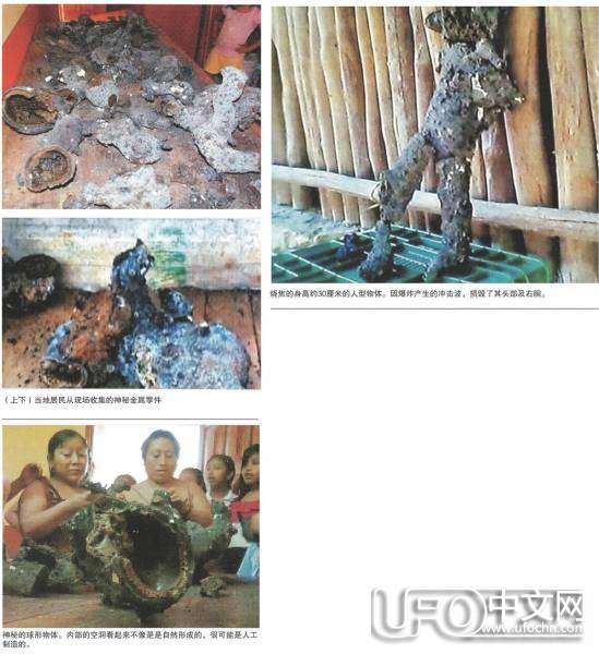 去年9月22日,在墨西哥尤卡坦半岛南部,发生了一起陨石坠落事件。当天午后8时30分时,在伊丘穆尔镇上空出现巨大火球,火球突然发生爆炸并伴随着轰鸣声坠落在地上。整个伊丘穆尔镇因此事暂时停电。当人们赶到现场查看究竟时,却发现了很多地球外文明技术制造出的不可思议的金属片和人型机器人。 在陨石坠落现场,笼罩着浓浓的黑烟,还有一股刺鼻的焦糊气味。当人们靠近查看时,看到的并不是陨石碎片,而是某种类似于金属的碎片。在这些碎片中,有人还发现了一个身高约30厘米,被烧焦的尸体躺在地上。难道,坠落的不是陨石,而是UFO?