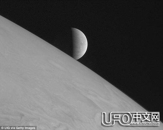 新视野号探测器拍摄的这幅图像上展示了木卫二从木星云层上方升起的景象。美国宇航局正在筹划一项前往木卫二的探测计划,预计于2022年左右发射升空。科学家们希望能够确认这颗冰卫星上是否存在宜居环境