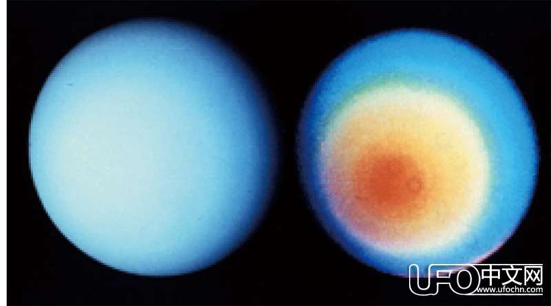 天文学家猜测,这颗星球上空被一层由冷凝过但仍然灼热的矿物质组成的流速缓慢的云层覆盖,在这之上是一层清洁的大气。云层能反射大部分光线,而高层大气层中的氢分子会优先分化和散射蓝色波长。该高层大气层可能还包含钠原子,能够吸收红色波长的光。结果就是,这颗星球成了另一颗蓝色弹珠,但与地球截然不同。 我们甚至不用观察到HD189733b那么远就能找到其他蓝色星球。事实上,地球并不是太阳系中唯一的暗淡的蓝点。看看“旅行者”号拍摄的太阳系全家福,你会发现天王星和海王星也是蓝色的(事实上,海王星的颜色还要深一点)。在这两颗行星上,我们钟爱的蓝色并不是由海洋或者类地大气层产生的。 这两个笨拙的寒冰巨人之所以呈蓝色,是因为它们的大气层中含有微量甲烷。甲烷分子能够吸收多个波段的红光和红外光,唯独反射蓝光。至于两颗星球的蓝色色调为什么不同,仍然是个谜。海王星的大气层动荡剧烈,能将氨与水形成的冰的化合物从内层翻转到外层,很可能正是这一点导致了海王星的蓝色色调更深。同时,它的平流层可能含有更多的碳氢化合物。 因此,科学家认为,蓝色除了能代表一颗星球成熟到宜于居住以外,还有可能代表荒蛮的不毛之地。对生命来说,蓝色星球不过是一个糟糕的标志。