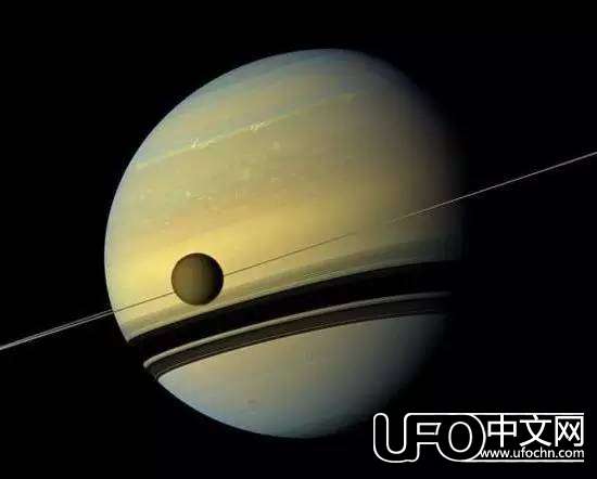 美国宇航局“卡西尼”号飞船发回的彩色图片显示,巨大的土卫六绕行到巨大的土星正面。