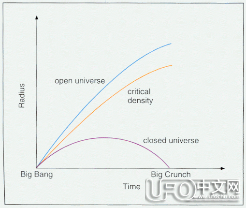 存在着三种简单的可能性。我说简单,是指和《金发姑娘和三只小熊》一样简单。让我解释一下:随着宇宙的持续膨胀,宇宙内的粒子总量是不变的,但是它的体积却在持续增大,这意味着能量密度会下降,因为膨胀速度取决于能量密度,所以膨胀速度也会下降。基于这个假设,宇宙的命运有三种(可能比较幼稚的)可能性。 膨胀得太慢了。如果膨胀速度在某一时刻低于特定值(将由能量密度决定),那它就会在一个有限的时间范围内下跌到零。因为引力仍然存在,所以我们的宇宙就会在那时进入退缩阶段(不再膨胀),宇宙会在大收缩中回到起点。这就是那个“火”的场景,大爆炸的遗留辐射将被重新点燃,一切将在烈焰中被烤焦。 膨胀得太快了。如果膨胀速度高于特定值,那宇宙中就没有足够的“东西”能够阻止膨胀永远进行下去。尽管膨胀速度会继续下跌,但它永远也不会变成零,而我们也会发现自己生活在一个“开放的宇宙”中,如上图所示。这被称为宇宙的“热寂”,也就是“冰”的场景。 不快不慢刚刚好。如果膨胀速度正好等于特定值,那膨胀的速度会接近零,但永远也不会达到零。假如宇宙中正好多出一个粒子,或者少了一个粒子,那结果就分别是前面两种场景,但后者所要经历的,是我们所能想像的最缓慢的热寂过程。 为了证明对这些场景而言,初始条件有多么敏感,下图所描述的,便是早期宇宙在“不同的”膨胀速度影响下,我们今天所可能拥有的不同宇宙。