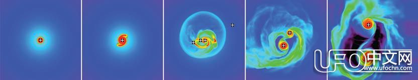 [图片说明]:冲破质量的上限。最近对恒星形成的计算机模拟显示,由于不均匀的生长,大质量恒星可以达到看似不可能的大小。来自原恒星的辐射会把气体吹散,在气体中产生巨大的空腔(泡),但是这并不能完全阻断气体的内流,因为物质会在这些空腔的间隙中形成丝状结构。上图为沿轴密度图;下图为垂直轴密度。从左往右:17,500年:原恒星形成,气体几乎均匀地下落。由下落气体释放出的引力势能造成了它发光;25,000年:当原恒星长到大约11个太阳质量的时候,其周围的盘就会变得引力不稳定,形成了螺旋结构;34,000年:当原恒星的质量超过了17个太阳质量,辐射会将气体吹散,形成空腔。但是周围的气体仍能流入。较小的原恒星形成;41,700年:较小的原恒星比中央恒星更快速地生长,并且很快在体积上超过了后者。吸积不仅在空间上变得不均匀,在时间上也变得不稳定;55,900年:数值模拟在中央恒星达到42个太阳质量、伴星达到29个太阳质量时终止。仍有28个太阳质量的气体剩余,它们最终仍有可能会落入恒星。版权:Science/Mark Krumholz et al.。