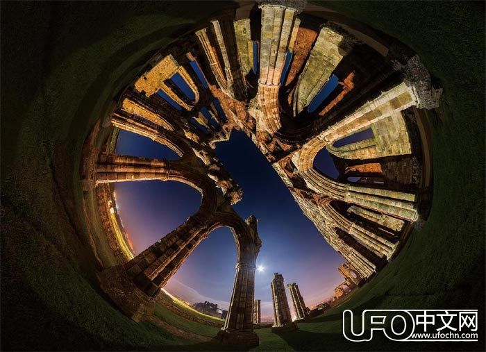 3惠特比修道院的月落 影像中,月亮在地平面附近绽放光华,并向惠特比修道院的拱门后方隐没。这幅360°全景的精彩鱼眼风格影像,是由23张数字照片拼接而成的。