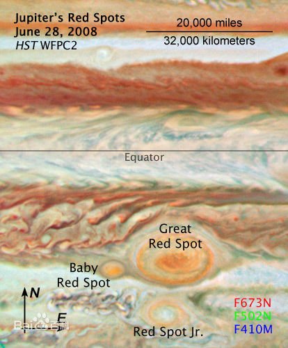 在大红斑中心部分有个小颗粒,是大红斑的核,其大小约几百公里。这个核在周围的反时针漩涡运动中维持不动。大红斑的寿命很长,可维持几百年或更长久。
