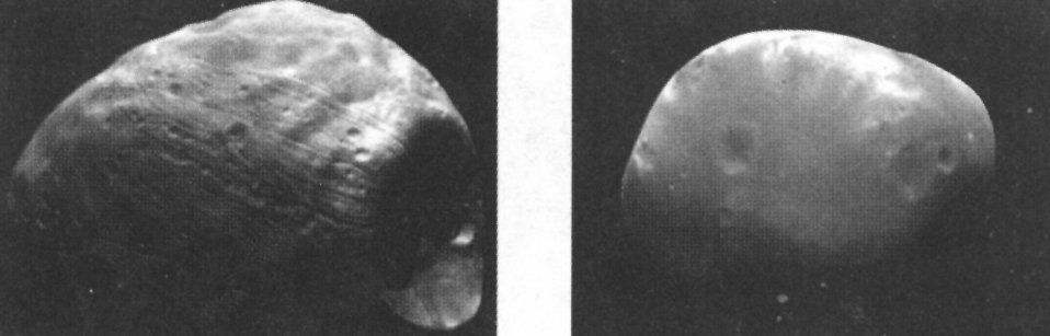 转眼一晃过了10多年,1971年,美国发射的“水手1号”无人飞船终于飞到了火星的上空,并绕着火星转了整整一年多,从它发回的资料终于让这个美丽的神话破灭了,因为它所拍摄到的两颗火卫的近距离照片上,可以清楚地看出,它们的形状极不规则,表面布满了大大小小的石坑,简直就像是被老鼠啃得不成样子的大土豆。科学家已经证明,正是这不规则的外形,加上它的质量较小,才造成了较大的加速现象。