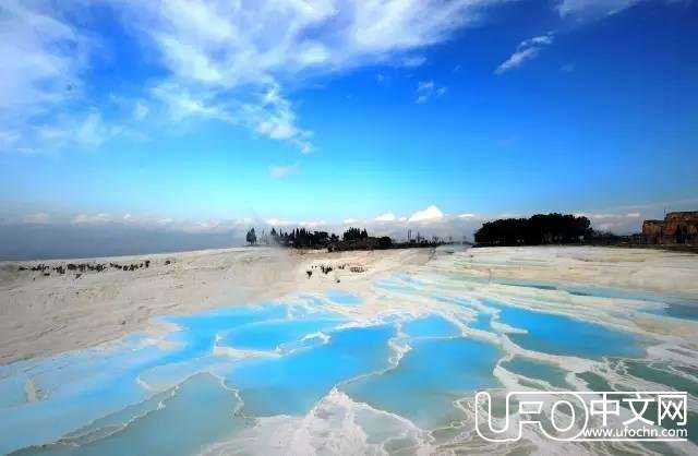 泉水从山顶往下流,历经千百年钙化沉淀,形成层层相叠的白色天然石灰岩阶梯,远看像大朵大朵棉花矗立在山丘上,土耳其人叫它“棉花堡”。