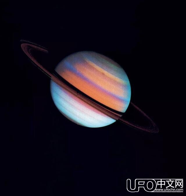 土星和土星环,土星环系统从云层上方7000千米处开始。尽管延伸了270,000 千米,但它只有200米厚,因此从侧视图看呈刀刃状。虽然它们看起来像硬盘,但是土星环实际是由水冰粒子组成的,从极小的灰尘颗粒大小到直径达10米的巨块不等。旅行者2号太空飞船拍摄的这幅图像,图片经过了色彩增强。