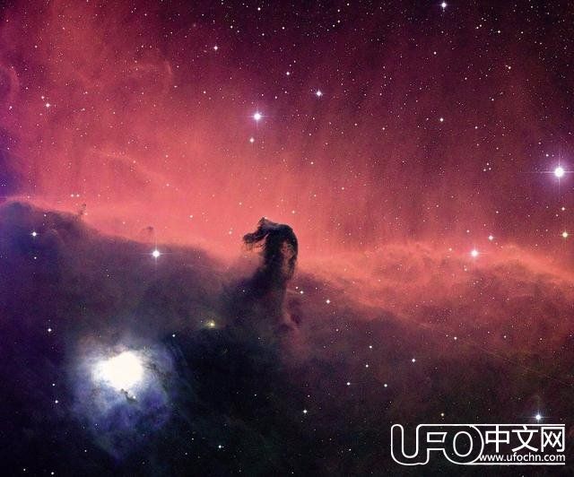 马头星云,距地1,500光年外。马头星云是猎户座中一团不透明的气体尘埃云,这张照片采用了长时间的曝光,因此背景明亮,显现出了马头星云。