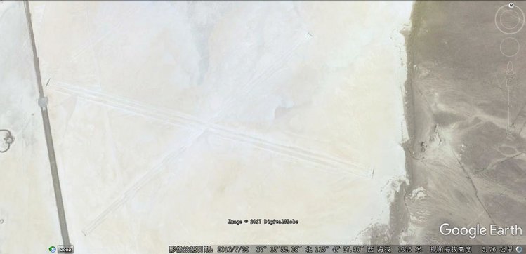 盐碱地存在一个大大地X形跑道,长约3.2公里;X左侧1/5处还存在一个长约20公里的圆弧形公路。