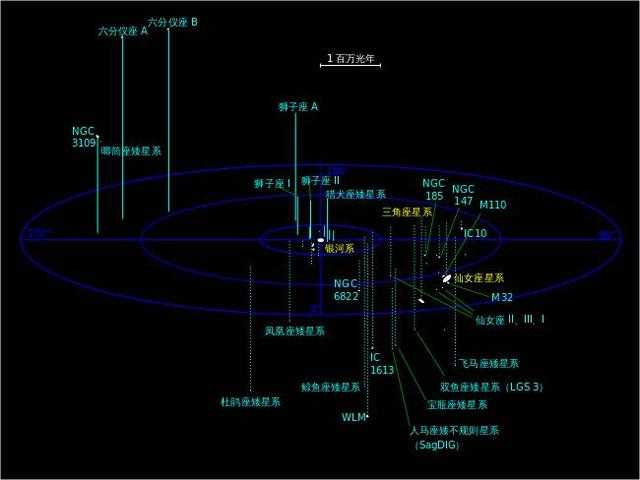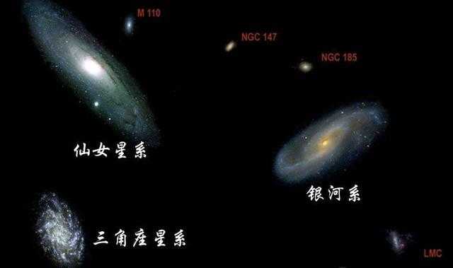 仙女座星系是本星系群中最大的星系,直径约20万光年。而我们银河系直径大约只有10万光年。上图为本星系群中银河系和仙女座星系位置图。