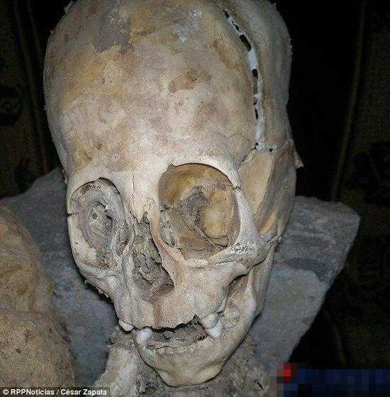【秘鲁发现神秘“巨头干尸”】这具“巨头干尸”是由秘鲁东南部库斯科一家博物馆的工作人员雷纳托·达维拉·里克尔姆在曲斯皮坎奇省南部城市安塔瓦伊利拉发现的。据里克尔姆描述,这具干尸的头骨巨大,长度和其下面的身体部分相当,均为50厘米,该头骨形状怪异,上面深陷的眼窝比正常人的大很多,顶部有一块柔软的部分,类似婴儿出生时头顶没有骨质的“囟门”。嘴部长两颗巨大臼齿,而这种牙齿一般只有上了年纪的人才会长。人类学家在看到这些头骨的怪异特征后感到很不解,研究人员正准备对头骨右眼窝里残留物进行DNA鉴定,以确定这具残骸是否属于人类。