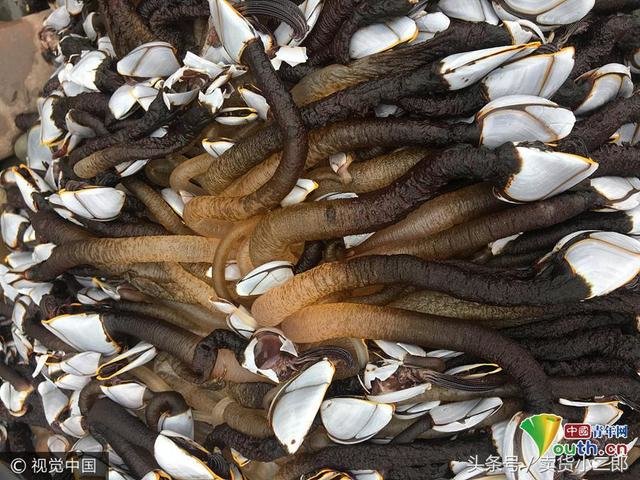 鹅颈藤壶在中国被称为狗爪螺,是藤壶类生物。又名海鸡脚,有“来自地狱的海鲜”之称,生活在海流交换较为频繁的岛屿礁石缝隙里,它的生长环境对水质要求很高,微量元素高,味道鲜甜。