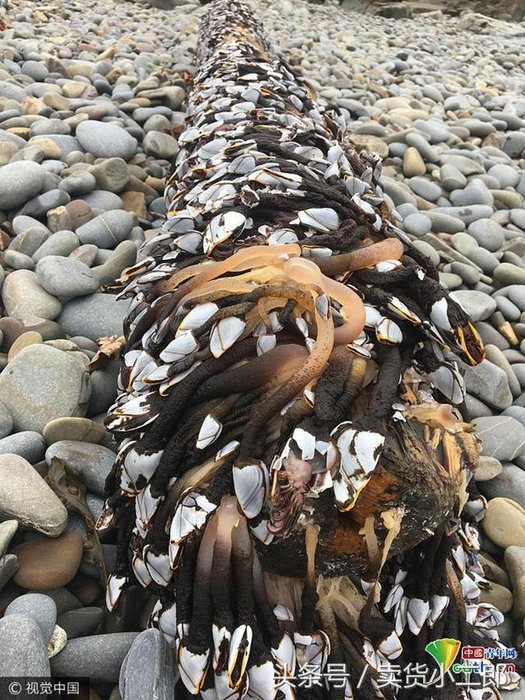 近日在英国德文郡,当地哈特兰海滩上出现一根奇怪的酷似地外生物的东西,经专家认证,这是一段被冲上岸的树干,上面布满了稀有的鹅颈藤壶。