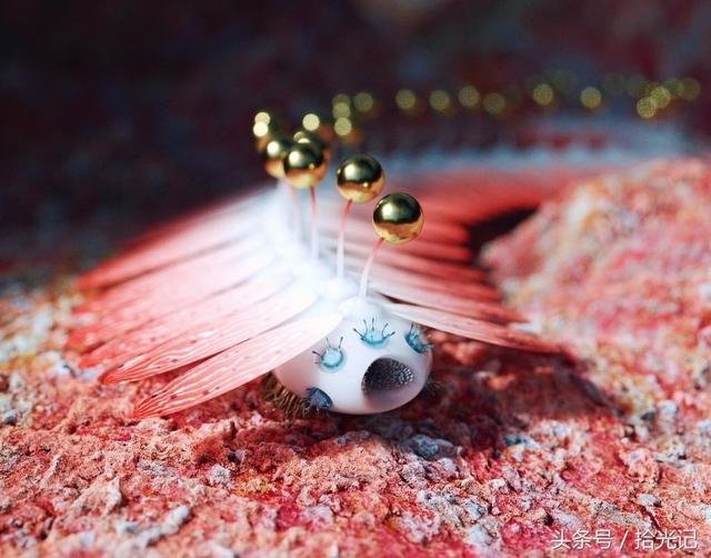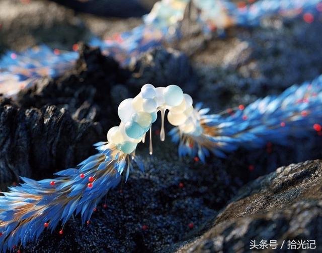 这只球形生物活跃在岩石之上,可以自由活动,身体长着不少眼睛,蓝红色的触角上挂着唾液一样的珍珠串,可别掉以轻心,这可是它分泌出来的毒液,一旦触碰便全身麻痹任它宰割。