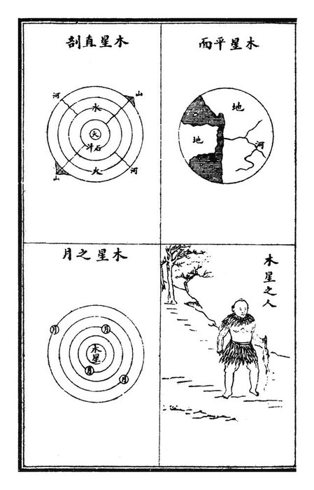 至于各大星球上的外星文明,则更是奇诡。康有为在《大同书》中曾流露出对外星文明的神往,江希张在康有为处看过《大同书》,或是受了影响。《大千图说》所绘外星文明的形貌,除了三头六臂的畸形之外,更多的是长了翅膀,从双翼到多翼,数目不等,还有的头上长角,俨然鬼形。不难看出,《山海经》对海外神异国度的想象,为《大千图说》提供了一种可借鉴的样本,只不过《大千图说》把这种模式搬到了宇宙空间,整个宇宙都在其体系关照之下,昔日的殊方异域之国,如今改作了星球,虽掺入了现代天文学的知识,但实质几无大变。比如水星人平均身高五尺,说话像鸟叫,住在山洞中。金星人有双翼,能在空中飞行,入水火不伤,平均寿命五十岁,其文字刻在金刚石板上,足以不朽。火星人身高一丈,说话像老虎吼叫。木星人尚未开化,还处于蒙昧时代,以生吞野兽为食。土星人是高智慧生命,智慧如神,生活在洞穴中,以水果为食物。遥远的天王星和海王星则没有人居住。