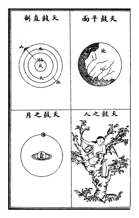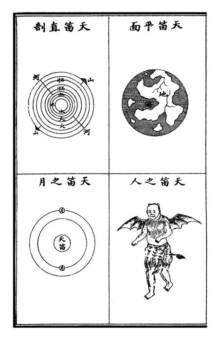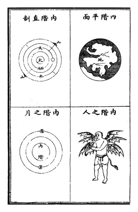 江希张在《大千图说》中写道:“三界总形,如西瓜然,其中之子,则中界各星球也,其中之瓤,则中界各星球之空气与轨道也”,以西瓜作比喻,想来颇有道理。该书虽引入了一些现代天文学的知识,却也掺杂了大量中国传统中的糟粕,书中的“上界”,即道家神话中的天神居所,而“下界”,即民间传说中的阴曹地府,阎罗判官,牛头马面,刀山油锅,生前作恶之人,此刻正在地府中受到酷刑的摧残。而“中界”则相当于今人所认知的宇宙,除了太阳系之外,还有北极星系,南极星系,宇宙的图景渐次呈现。