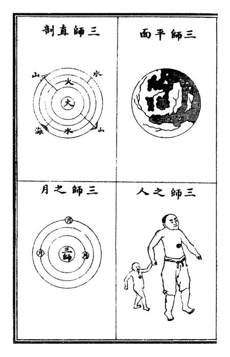 在太阳系中,太阳最为明亮,书中说太阳“自转而不动移,乃恒星也”,但紧接着却说“其热力极大,人不能生,故太阳星君居焉”,并附一幅太阳星君的画像,袍服冠冕,俨然帝王之尊,现代天文学的知识之上,又叠加了神仙之说,呈现出新旧观念混搭的局面,科学在本土化的过程中,难免夹带些中国的烙印,这位不怕高温的太阳星君,俨然是个尴尬的角色。