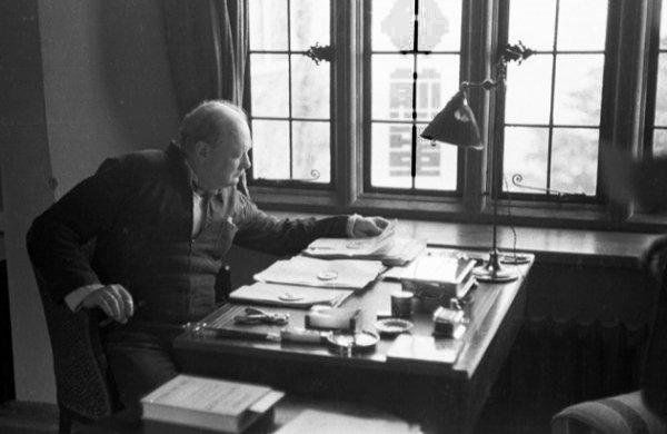 1939年丘吉尔在办公桌前。作为一个高产作家,他的论述涉及科学的多个话题,如进化论和核聚变。