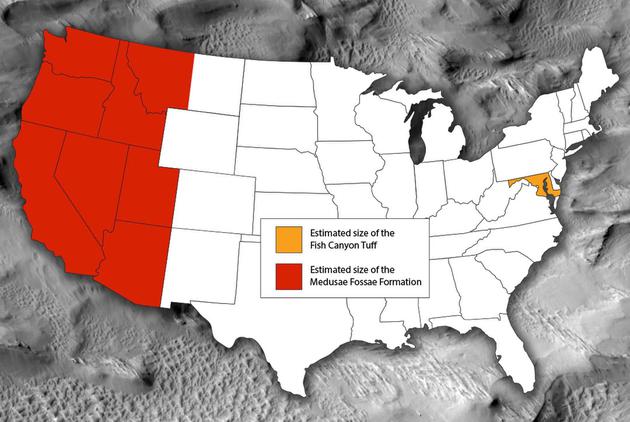 图中是火星梅杜莎槽沟层面积大小(红色部分)与地球上最大火山沉积层鱼峡谷凝灰岩(黄色部分)的大小对比,后者是地球上最大的火山喷发沉积区域。