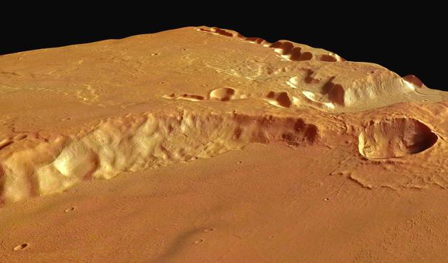 对于火星远古时期火山喷发的证据,欧嘉和同事凯文·路易斯(Kevin Lewis)观察了火星最神秘的地质标志:风沙侵蚀形成的山丘,以及被称为梅杜莎槽沟层(Medusae Fossae Formation)的台地结构。欧嘉说:这是一种巨大的沉积地形结构,不仅存在于火星表面,而且还存在于太阳系内其它星球。
