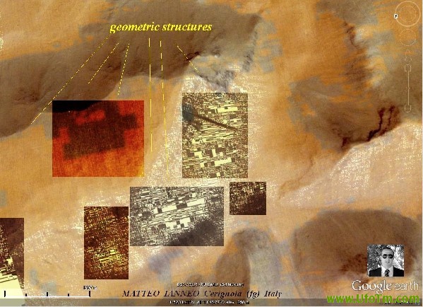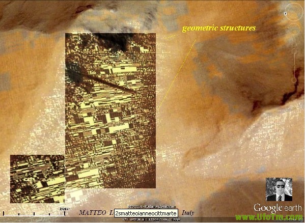 去年,意大利研究员Matteo Ianneo 发现了火星上5个看起来像人类的面孔,现在他又发现了一些惊人的有趣的构造。他声称在火星上找到看起来象一个城市的几何结构。这次新发现的城市和他的首次发现相隔一年,在2011年4月他曾在火星上发现一个水晶般透明的面孔(雕像),看起来比著名的基多尼亚火星面孔好看多了。