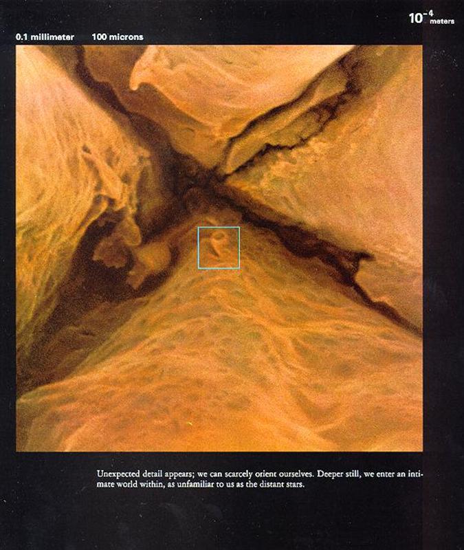 你来感受一下宇宙从10亿光年到0.1飞米的视觉,绝对震撼! 10亿光年(1025米)十亿光年,是一个什么概念呢? 光年,光走一年的路程。光速!它是速度公认的极限,每秒299792458米,能在眨眼间绕地球七圈半。看见么,就这么快的光,让他跑吧,跑个一年,所度量出来的距离就是一光年了。现在各位把鼠标移到屏幕的左下角,点“开始”-“程序”-“附件”-“计算器”,都来动手算算它,这一年是31536000秒,一秒跑299792458米,乘出来就9454254955488000米,约等于十万亿公里吧。你说什么,简直天文数字?废话,天文上的数字当然得是天文数字啦~~~~~但这也仅仅只不过是一光年的长度。 当我们看到十亿光年以外的星星时,映入我们眼帘的那束星光已经在茫茫宇宙间飞奔了十亿年。换句话说,我们现在看到的仅仅是它十亿年之前的样子!现在的它究竟如何我们只有再等待十亿年才能看到……不寒而栗! 普遍认为宇宙诞生到现在有150亿年。所以我们可能观察到的最广阔宇宙空间的直径只可能在150亿光年这样的范围之内。150亿光年远的地方的光被我们看到时已经在宇宙间穿越了150亿年,那是宇宙诞生时的影像!!! 下面这张图是在十亿光年这样的数量级下观测宇宙,上面的每一个象素点所表现的事物都是无比古远的。 1亿光年(1024米)现在我们把视野缩小10倍,宇宙看起来还是空空如也,“星”光点点。可是,那些点点斑斑的真的是星么? 1000万光年(1023米)把眼光再降低一个数量级,那些点点看起来依然象是星星哦^_^ 100万光年(1022米)近些,再近些。???什么呀,这么面熟?这就是你所说的“星星”么?是星星,一堆星星。我们管它叫银河系 10万光年(1021米)这是银河系,我们的家园。来个特写,茄~~子~~~ 在10万光年这样的数量级下,我们就看见了整个的银河系。事实上,银河系的直径就是十万光年。真有哪位能发明个跟光速一边快的飞船,从银河系的这边飞到对面来个大吊角,就要十万年的时间!我*,在这样漫长的旅程来看,人生不过朝生暮死,蜉蝣一般。但这只是对相对于银河系静止的观测者而言,船上的人员感受到的旅程其实只有数分钟。相对论呀,深了去了。 1万光年(1020米)夏夜在内蒙的草原上,平生第一次如此清晰的看见了银河,一条黯淡的光带横亘夜空。由此就能够大致估计出我们的位置,如果把银河视为一个巨大的扁盘子(饥饿者也可把它视为大饼,麻酱白糖的^_^)我们就是应该在这张扁盘子的平面上。否则如果不是这样的话,我们高于或低于它,那么看到的夜空就会显得一半亮一半暗,而不是象现在这样银河光带般亘在天幕中,星星比较均匀地分布两侧了。 事实上现代研究也得出这种结论:我们的太阳系位于银河系螺旋翼内侧的边缘,距离银河系中心大约2.5万光年。于是,我们把视野收回到1万光年的数量级,聚焦在银河系若干触角般螺旋翼中的一条上面。 1千光年(1019米)密密麻麻! 100光年(1018米)再近点,还是密密麻麻 10光年(1017米)又是密密麻麻! 1光年(1016米)等等,这是什么? 1万亿千米(1015米)再走近十倍依然雾气昭昭的一团,到底是什么嘛? 1千亿千米(1014米)这回看清楚了吧,原来是太阳系!我们在密密麻麻的星星中跋山涉水,翻山越岭认出了它,不易呀! 100亿千米(1013米)放大十倍来观察以繁星为背景的太阳系。说是繁星,其实与太阳最近的恒星——半人马座比邻星都是在4.22光年开外的。图中的亮点仅仅只是背景上离得八丈远的星星呢,并不是太阳系的一部分 10亿千米(1012米)数数看,下图里被蓝框子圈上的是谁的轨道?水、金、地……原来是地球的轨道呀! 1亿千米(1011米)地球在哪里? 1000万千米(1010米)哦呦~~~大圈套小圈呢,月球围地球转的轨道。 100万千米(109米)是什么?飞机?还是鸟?是超人?都不是…… 10万千米(108米)欢迎回家, 是地球 1万千米(107米)用一万公里的视野看地球 1000千米(106米)如果我记得不错的话,地理课上教过,这是北美五大湖区中的密歇根湖,框住的城市就是芝加哥 100千米(105米)不看不知道,世界真奇妙。芝加哥鸟瞰。并由此开始了我们人类所能够理解的数量级,开始了我们熟悉的世界 10千米(104米)密密麻麻,房屋,湖边的房屋。小二,上几瓶啤酒,哥几个先喝着 1千米(103米)我有一所房子,面朝大海,春暖花开。 100米(102米)呦!草地上这是什么呀,一坨? 10米(101米)原来是一傻哥们睡得正香呐。 1米(100米)醒醒嘿,都被偷窥啦还不知道呐。 0.1米(10-1米)一米的十分之一,也叫分米,我们手所能把握的尺度。相信人类所接触的大部分物体都是在这样一个数量级的。看看你的周围,键盘、鼠标、手机、杯子、碗……仔细一看这哥们手上的毛还挺重的,纯爷们 1厘米(10-2米)这是他手上的皱纹细部。兴许你放大了还没他细皮嫩肉呢。做好准备,我们即将进入另一个陌生的领域——微观世界 1毫米(10-3米)手上的毛孔。可是,汗毛呢?晕! 100微米(10-4米)再放大十倍,依稀可见皮肤的组织结构。我是学生物的,以前老看,见怪不怪了。 十微米(10-5米)一个细胞的数量级就是10微米,当然这只是一般来说。插句嘴,世界上最大的细胞是鸵鸟蛋,它是一个单独的卵细胞,数量级是分米级的,厉害吧。 1微米(10-6米)疑似生物课上学过的细胞核膜,细部。 0.1微米(10-7米)我*,一看这么高度螺旋的结构就知道是染色体了。底下的洋文说:但凡人类的细胞,里面都会有23对染色体(46条)。 100埃(10-8米)埃是一种长度单位,指10的-10次方米。用字母“A”顶上加个小圆
