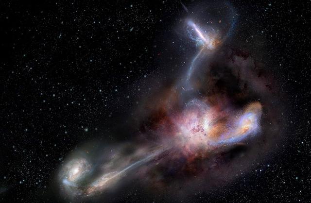 宇宙中最亮的天体其实是来自于宇宙中最暗的天体——黑洞。虽然黑洞本身不发光,而且还会吞噬光,但它们可以让周围的物质发光。很多星系的中心都有一个质量极为庞大的超大质量黑洞,而在早期星系中,星云物质非常丰富,超大质量黑洞会不断吞噬这些物质。当星云绕行超大质量黑洞时,在黑洞引力的加速下,落向黑洞的物质会互相剧烈摩擦,从而产生能量极高的电磁辐射,这种活跃的超大质量黑洞被称为类星体。