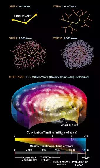 对于星际殖民的方法,有一种假想,就是创造一种能够航行到别的行星的机器,然后用利用新行星上的材料花 500 年左右的时间自我复制,然后将两个复制品送向下一个目标,即使用比光速慢的多的速度航行,这个模式也能用 375 万年的时间完成整个星系的殖民。