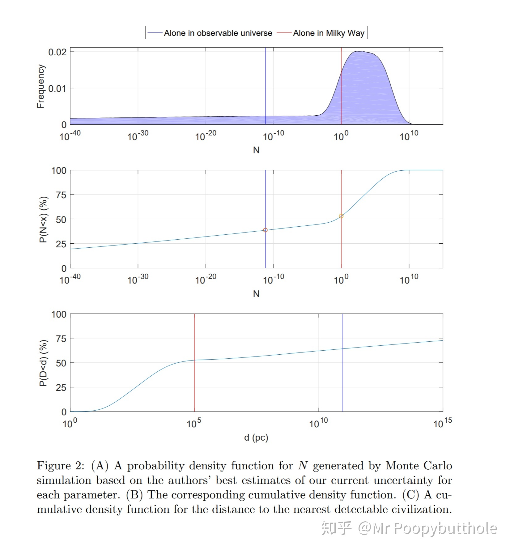 之后该答主说在可观测宇宙之内,存在有其他可接触文明的概率极低。 但是事实上从图(B)中可以看出,可观测宇宙中不存在其他文明的概率为38%,即有62%的概率存在其他文明。私以为这一概率并不能称之为极低。