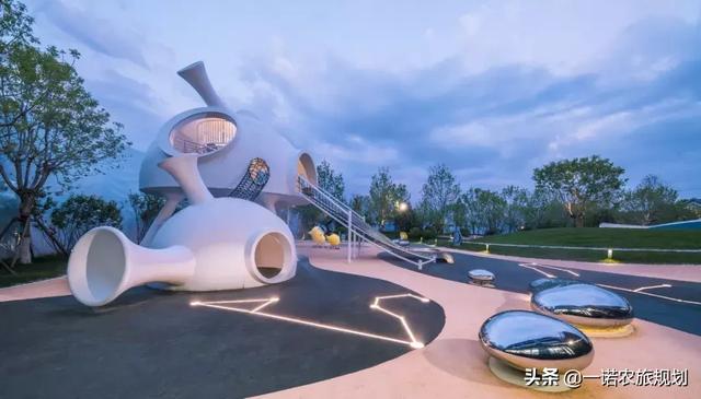 运用场景化的设计手法,完整再现了外星人“好海幼”来到地球的故事,以主题乐园化的方式打造完整的儿童主题。不同于以往埋头只做景观,