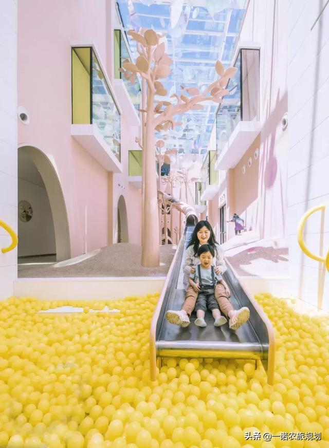 大量的粉色在墙面、滑梯、天空树树的艺术装置上,扩充了室内的体积感。同时球池里堆积的黄色,吊顶吊装炫彩的装饰片随着阳光摇曳,用色彩来表达空间,将陨石村的故事延伸到现实加深人们对空间的记忆。