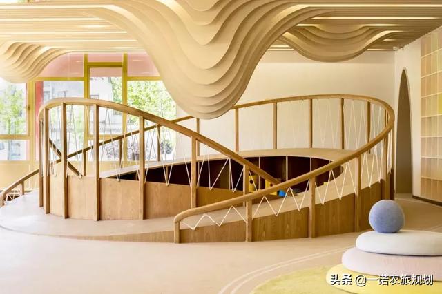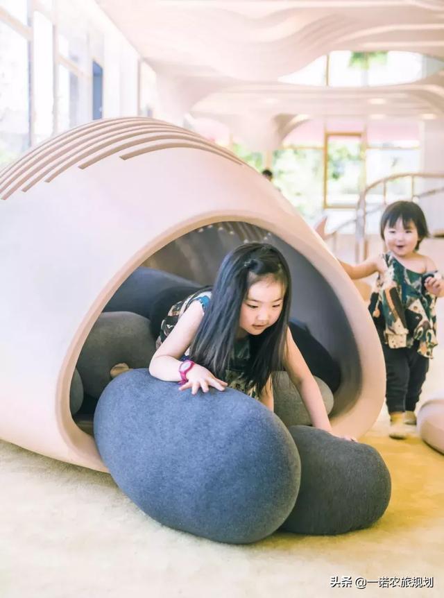 流线型的吊顶,大大小小的陨石屋散落在地上,螺旋星系的阅读书屋空间,让所有来这里的孩子,充分的享受这个环境,各得其所。