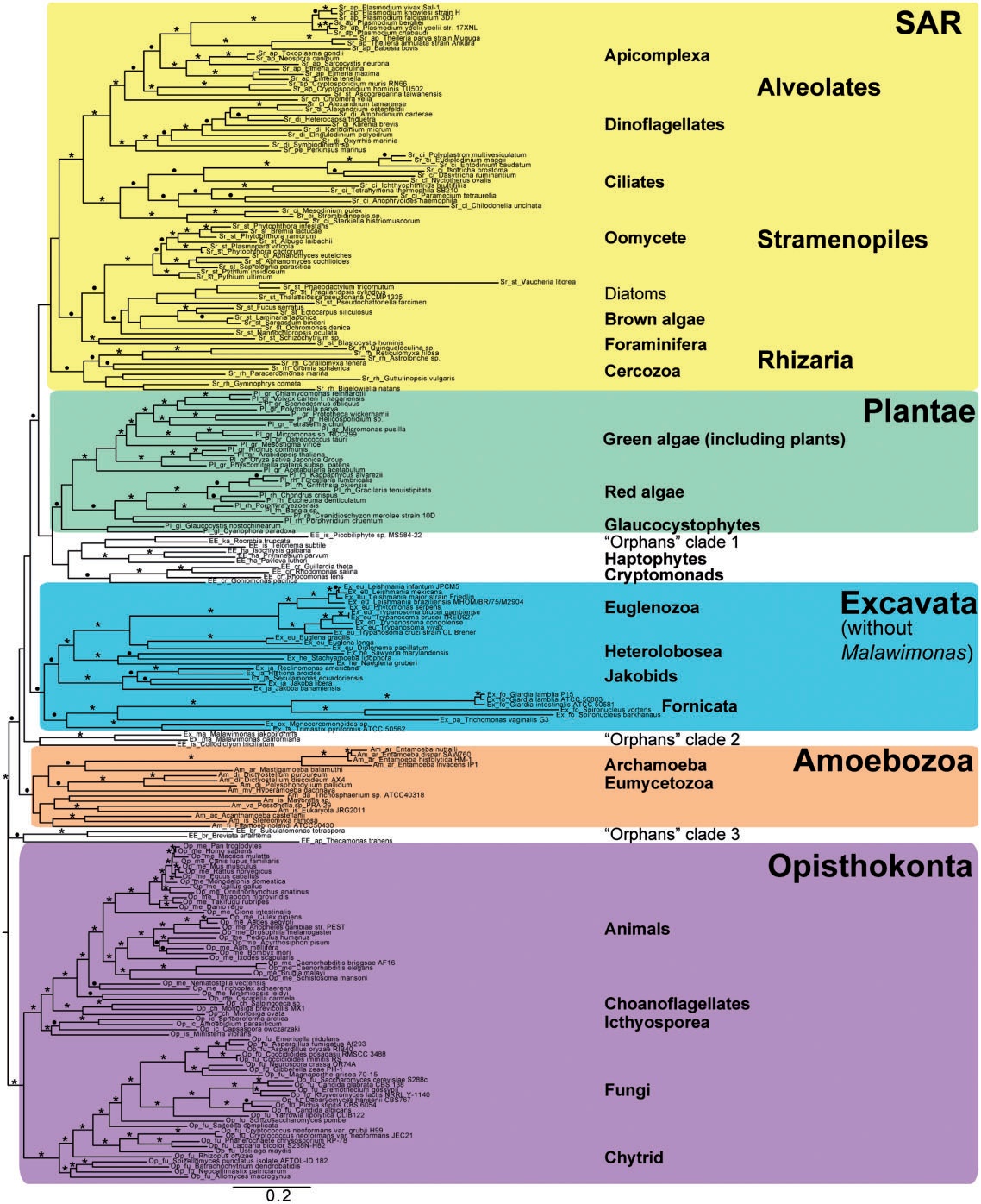 看不懂不要紧,我依次来详细说说。树上面五个不同颜色的大块标记了该项研究所发现的五个支持率高的单系类群(也就是可以被承认为符合真实进化历史的类群),分别为,SAR超类群、植物(Plantae)、古虫(Excata)、变形虫(Amoebozoa)、后鞭毛生物(Opisthokonta,包括真菌和动物)。而那三个没有染色的空隙,就是三个种系发生不明的孤儿分支,我们还不知道它们是从哪里来的。从上到下依次说说这些都是什么生物。