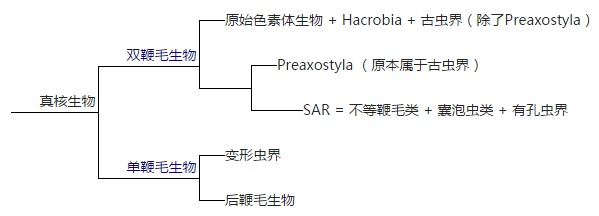 SAR超类群:名字来自这个类群里面三个大类群的首字母,分别是 囊泡虫类(Alveolates)、不等鞭毛类(Stramenopiles)和有孔虫(Rhizaria):