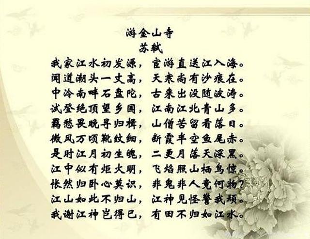 宋代诗人苏轼在宋神宗熙宁三年-公元1071年,当时的苏轼年仅三十六岁,正前往杭州任命的途中,路过了江苏省镇江市,后来到了城外长江附近的金山寺中,并拜访了寺内的长老后,便借宿在这金山寺中。