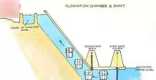 在港口就会有成千上万吨的石块,接下来的问题就是要怎么把这些石头一层一层的运上去?在往上的渠道中间,古埃及人设置了许多道闸门,当第一道闸门开启的时候,石头就会浮到第二道闸门处,再关闭第一道,打开第二道,如此类推。