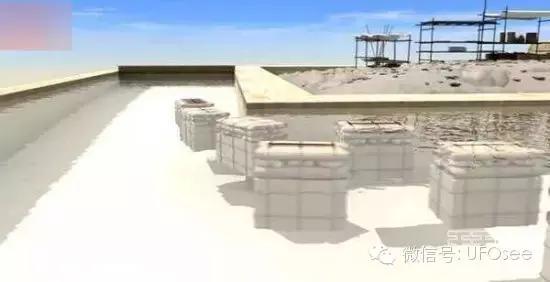 重建当时的施工平台就像是这样子,四面都有密闭的渠道,石头被浮力运送到目前的高度,周围也都由水包围。