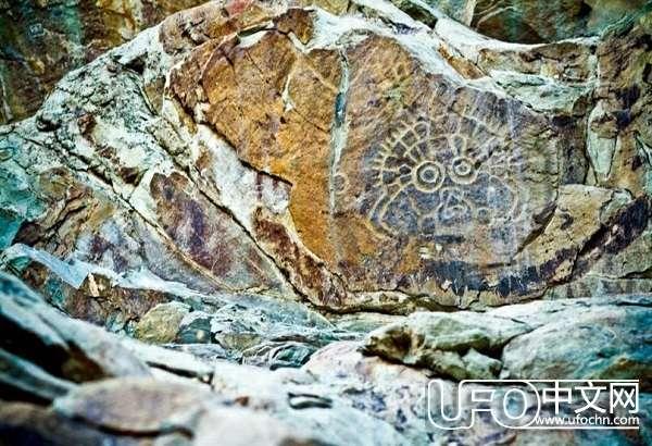 贺兰山南宁夏冲沟东的一幅岩画中,画面左上方有两个旋转的飞碟,飞碟开口处,一个身穿太空服的人飘然而下,地面上的动物和人群惊恐地跑散。