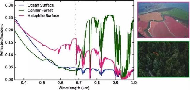 图4.行星表面海洋(蓝色)、针叶林(绿色)、嗜盐菌(红色)的反射率。图来自Schwieterman (2018, Handbook of Exoplanets)