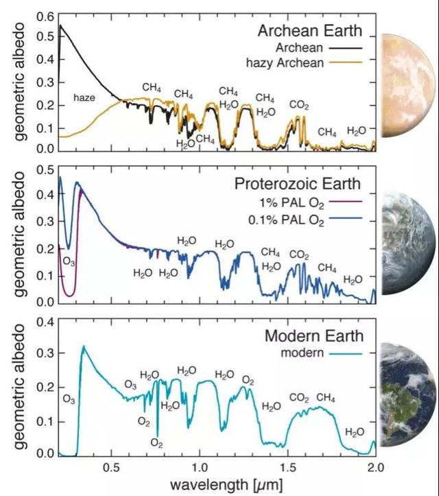 图3.太古代、元古宙和现代地球的反射光谱,可见紫外的臭氧分子吸收,光学波段的氧分子、水和甲烷的吸收。图来自于G. Arney (美国航空航天局戈达德太空飞行中心)