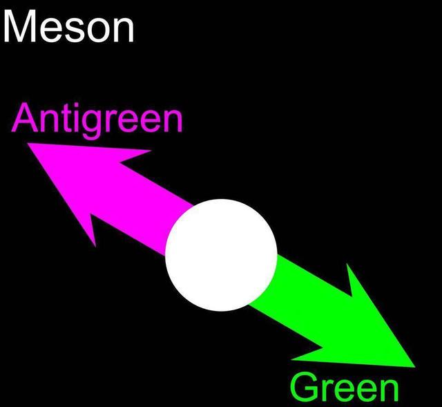 这些中间的色荷对应着反粒子的颜色:反颜色、青色和反红色、洋红色和反绿色、黄色和反蓝色是一样的。就像可以用红色、绿色和蓝色三种夸克组成一个无色组合(像一个质子),你可以用青色、洋红色和黄色的反夸克组成一个无色组合(像一个反质子)。