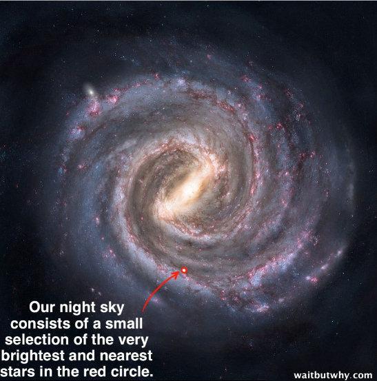 一个真正的星空似乎很大 – 但我们所看到的只是我们当地的社区。在最美好的夜晚,我们可以看到多达2,500颗恒星(大约是我们星系中恒星的百万分之一),而且几乎所有恒星都距离我们不到1000光年(或直径的1%)银河)。所以我们真正关注的是:
