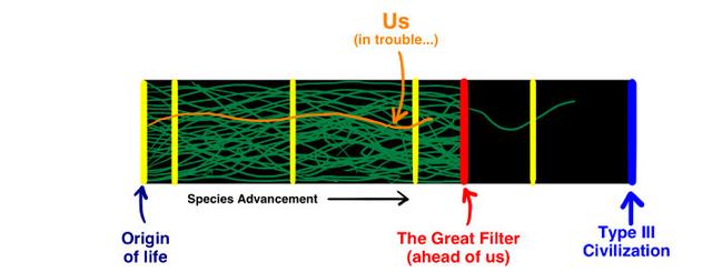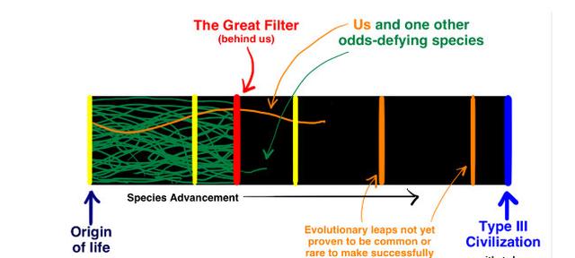 那些赞同第一组解释的人指出了一个叫做非排他性问题的问题,这个问题驳斥了任何理论,即“有更高的文明,但没有一个文明与我们有任何接触”第一组的人看数学,它说Re应该是数以千计(或数百万)的更高文明,其中至少有一个是规则的例外。即使一个理论支持99.99%的更高文明,另一个0.01%的人会有不同的行为,我们会意识到他们的存在。因此,第一组的解释是一定没有超先进的文明。既然数学表明,就在我们的银河系中,有成千上万的星系,那么一定还有别的事情在发生,这个东西叫做大过滤器。大过滤理论说,从前世到第三类智力,在某个时刻,几乎所有的生命尝试都会受到冲击。在漫长的进化过程中,有一个阶段是生命极不可能或不可能超越的。那个阶段是最好的过滤器。
