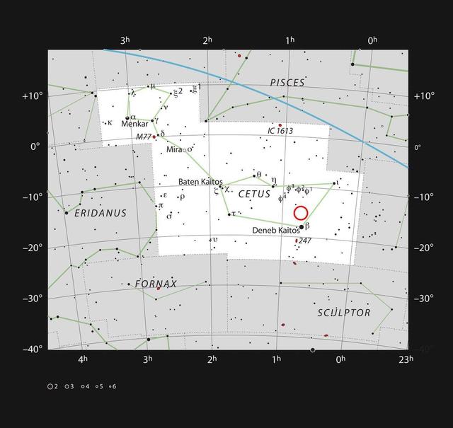 图解:红矮星LHS 1140位于光亮微弱的鲸鱼座(海怪座)的位置