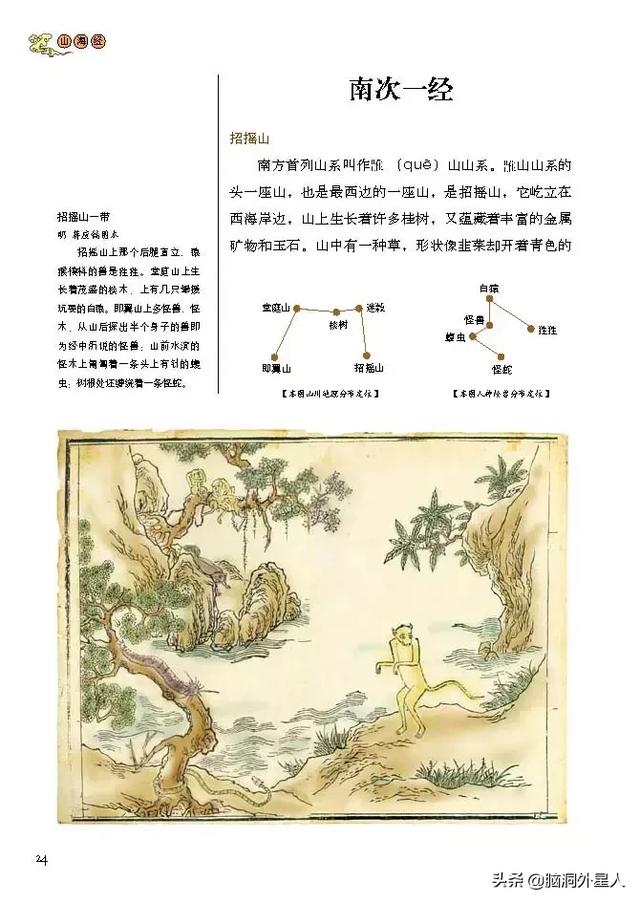 仅仅是这样,还是不够的。《白话彩图山海经》还有各种精彩的插图。前面提到的那些地理、怪兽的内容,如果只依靠文字叙述,会变得非常枯燥。