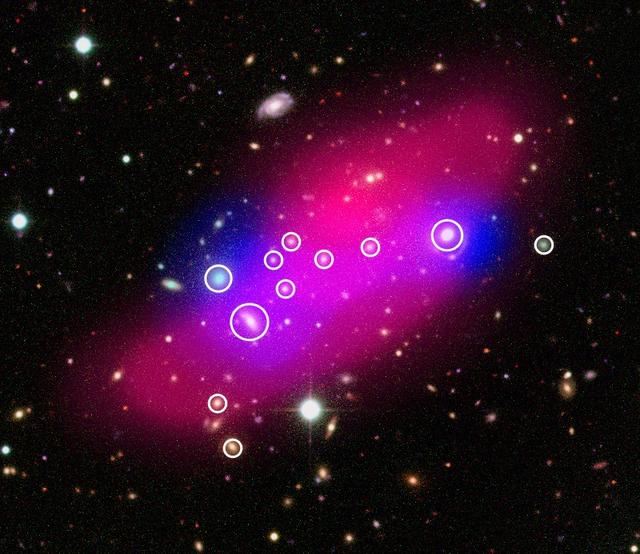 事实上,我们已经在宇宙中发现了相当数量的巨型结构(星系团),它们正处于高速的碰撞过程中。一些星系团刚刚经历了碰撞,而另一些则处于碰撞的后期阶段,已经稳定了下来,进入一个更平衡的状态。我们就可以在这些碰撞的星系团中获得:光学上的恒星图像(鸟枪弹丸),粉红色的气体x射线图像(泡沫),蓝色的暗物质质量重建图像(非碰撞物质)。